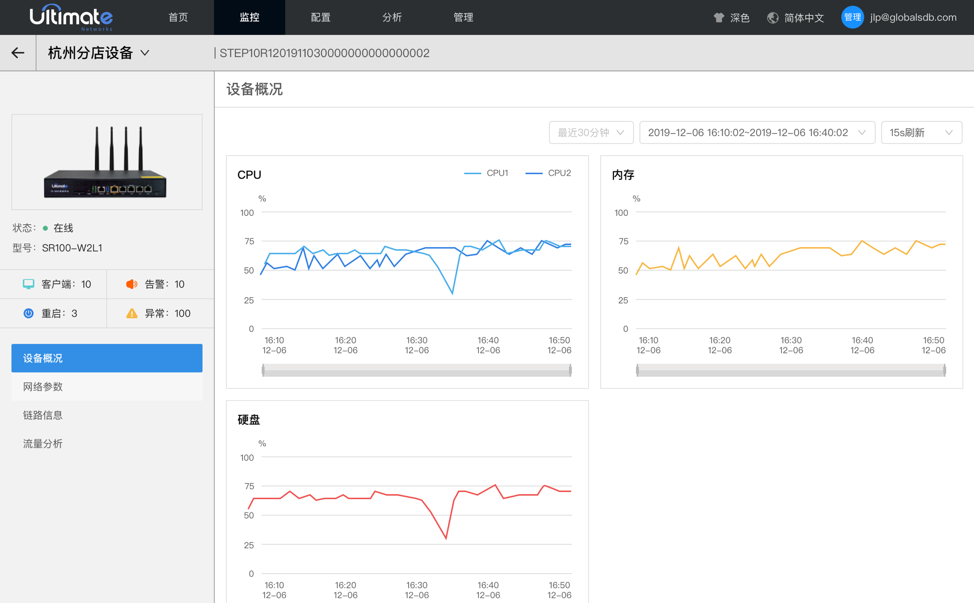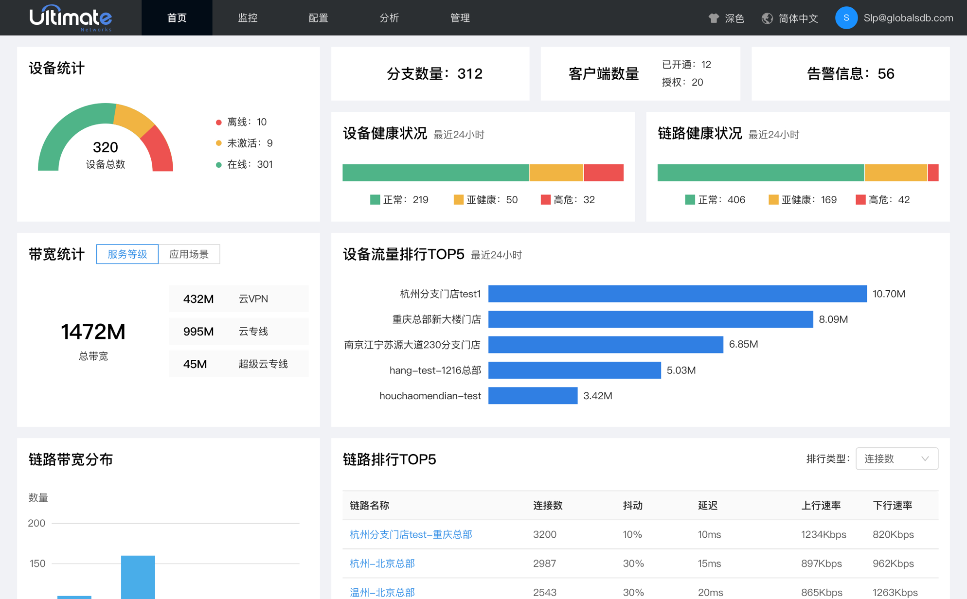 用户可按自己的业务意图来规划和设计网络架构,统一下发CPE设备配置。30+个可视化管理报表反映网络运行状况,如带宽速率、隧道质量、应用流量排行等。